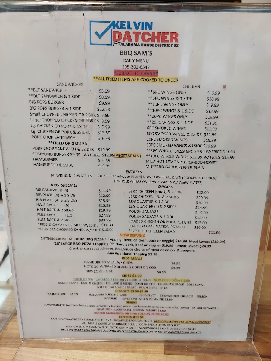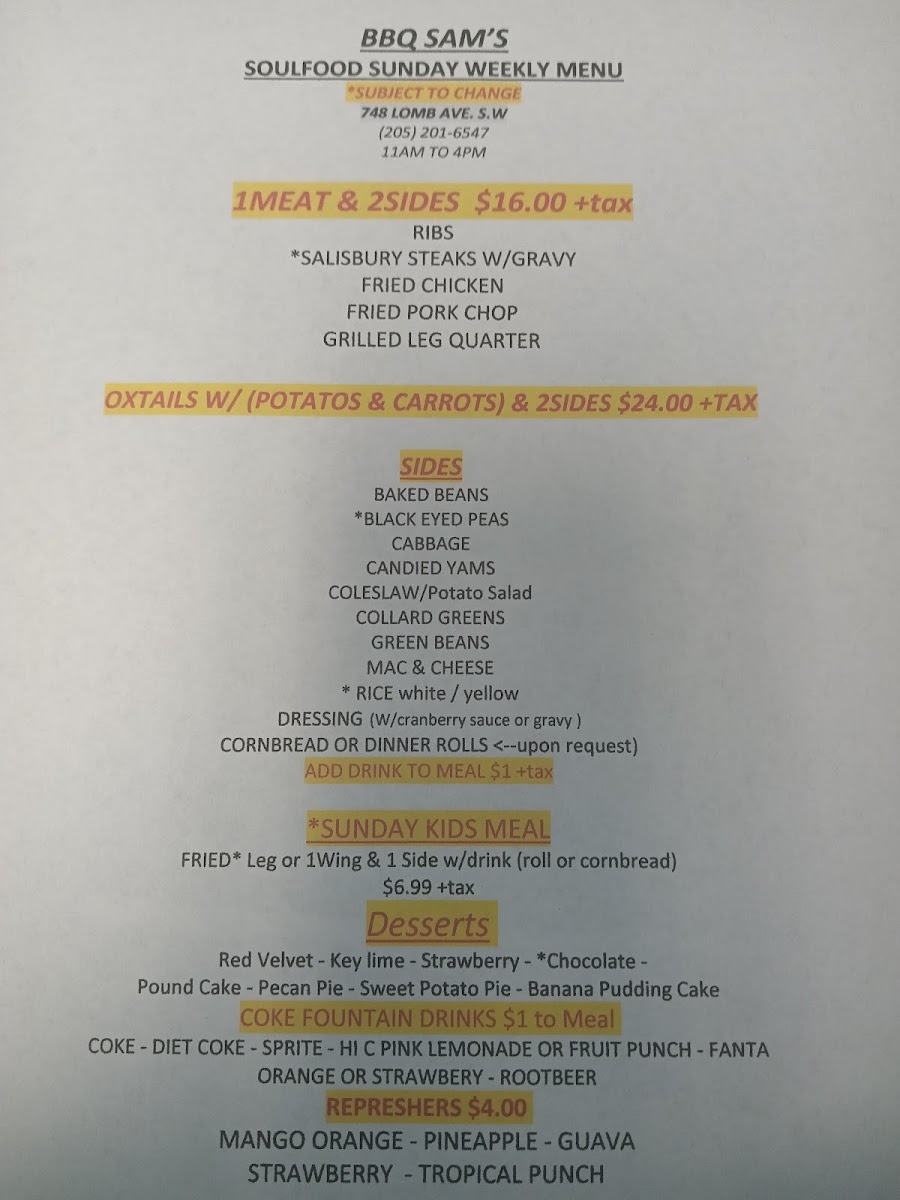 BBQ Sam's, located at 748 Lomb Ave, Birmingham, AL, offers a diverse and hearty menu that caters to a wide range of tastes and cravings. From delicious breakfast plates to savory soul food, every dish is crafted with care and full of flavor. Starting with their Breakfast Plates (served from 6:30 AM to 10:00 AM), you can enjoy a variety of options like Pan Sausage, Scrambled Eggs, Grits or Rice, and Toast/Biscuit, or the Salmon Croquettes, Scrambled Eggs, Grits or Rice with Toast or Biscuit, all perfect for jump-starting your day.