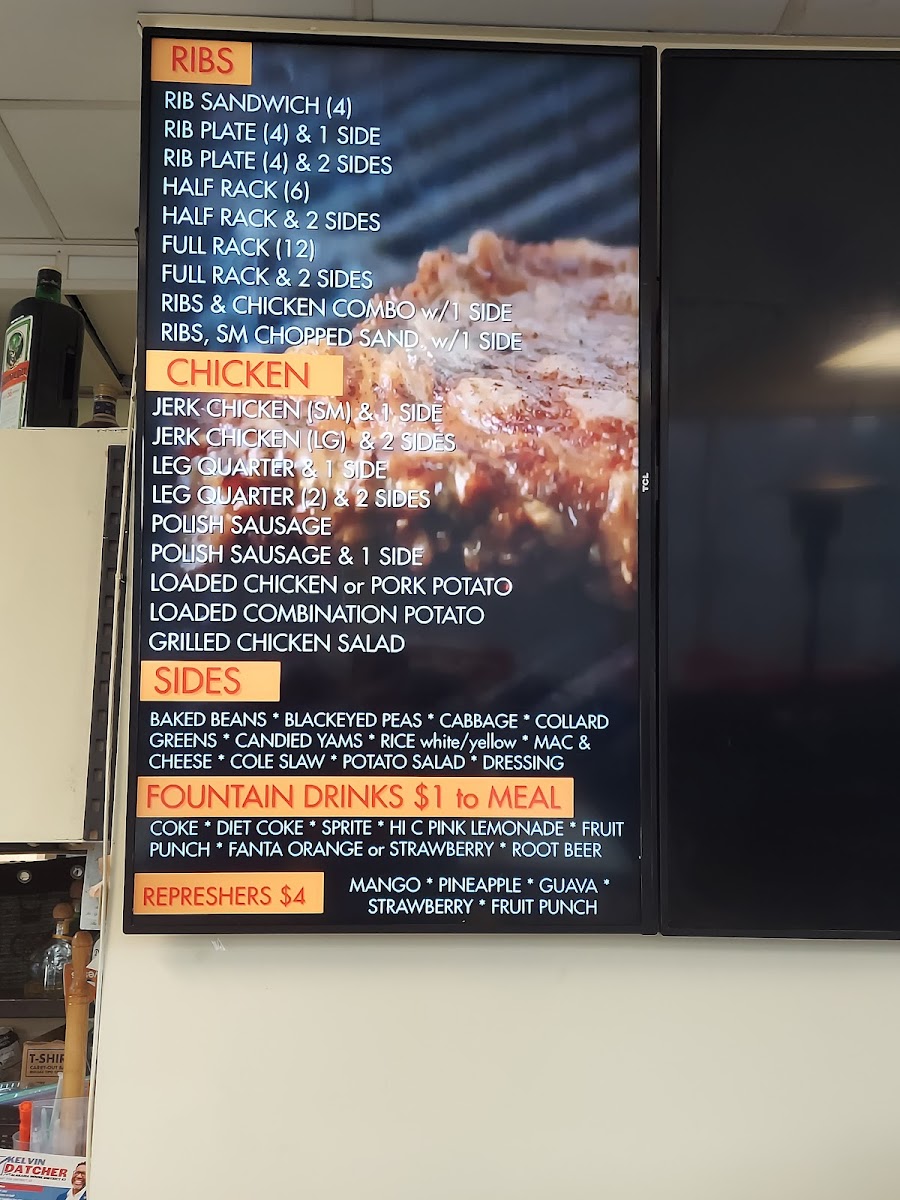 Pork ribs, available in half or full rack. Choose two sides: chips, baked beans, greens, mac & cheese, corn on cob, corn casserole, slaw, potato salad