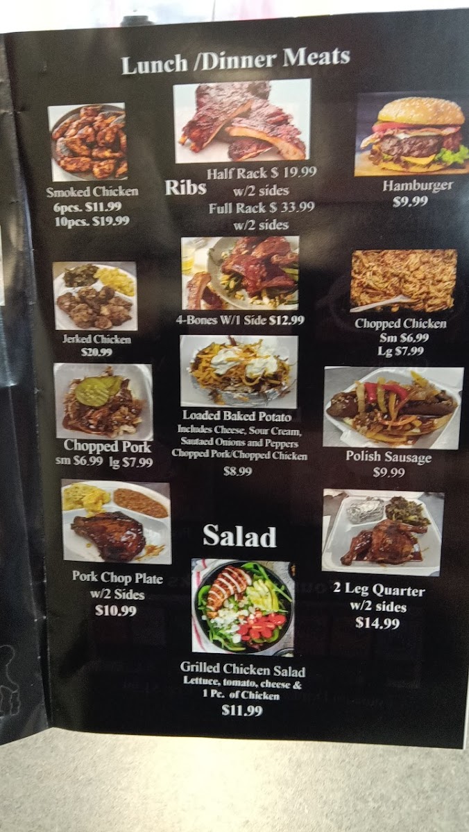 Tender leg quarters paired with your choice of two sides: baked beans, black-eyed peas, cabbage, yams, coleslaw, potato salad, collard greens, green beans, mac and cheese, mashed potatoes, rice, dressing.